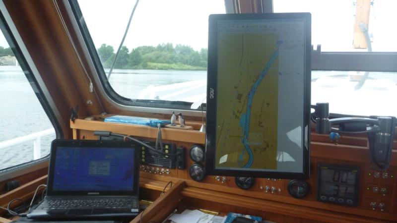 rechts: mit neuem Monitor (schwenkbar, drehbar, hier im Hochformat - ideal bei 'Kurs oben') mit PC-Navigo